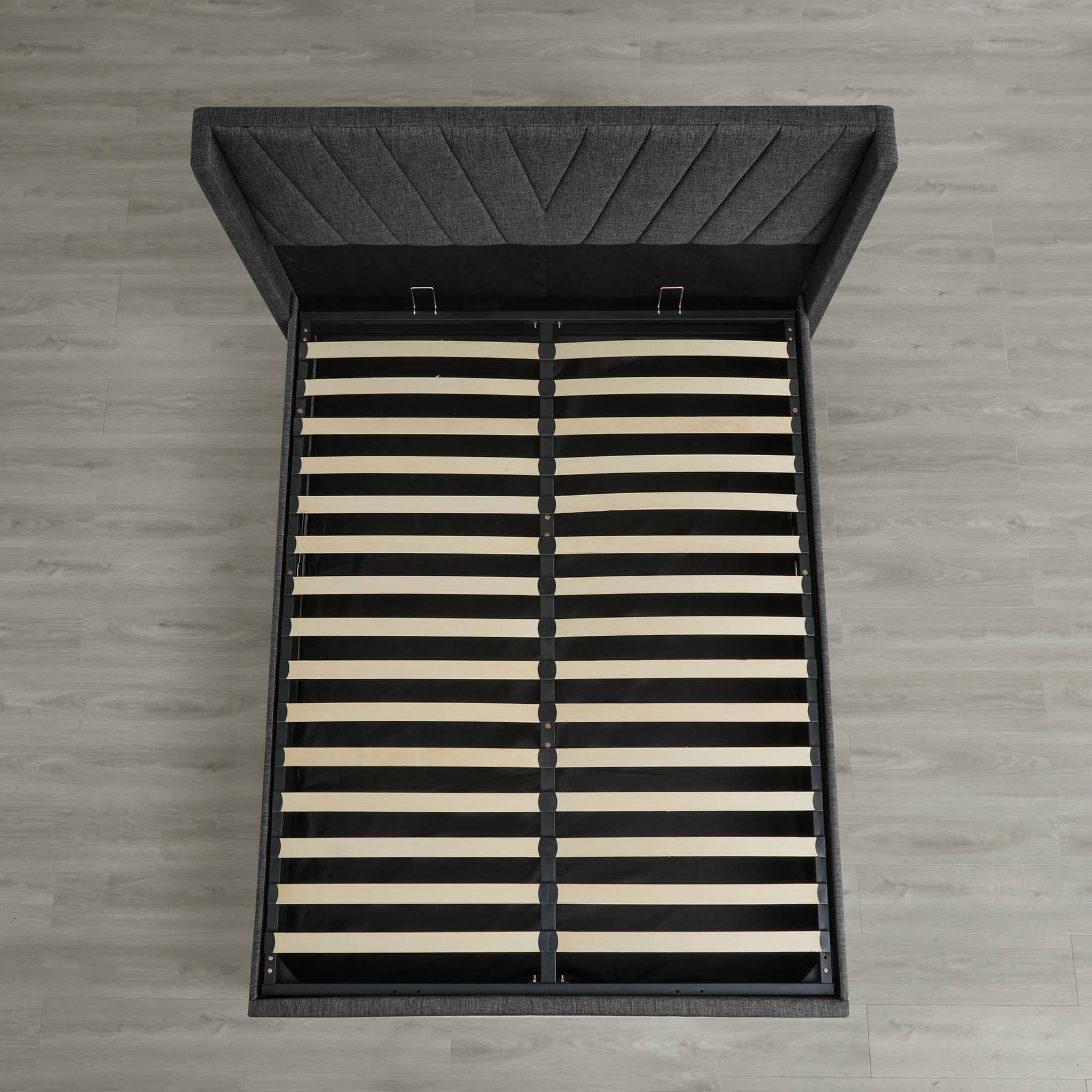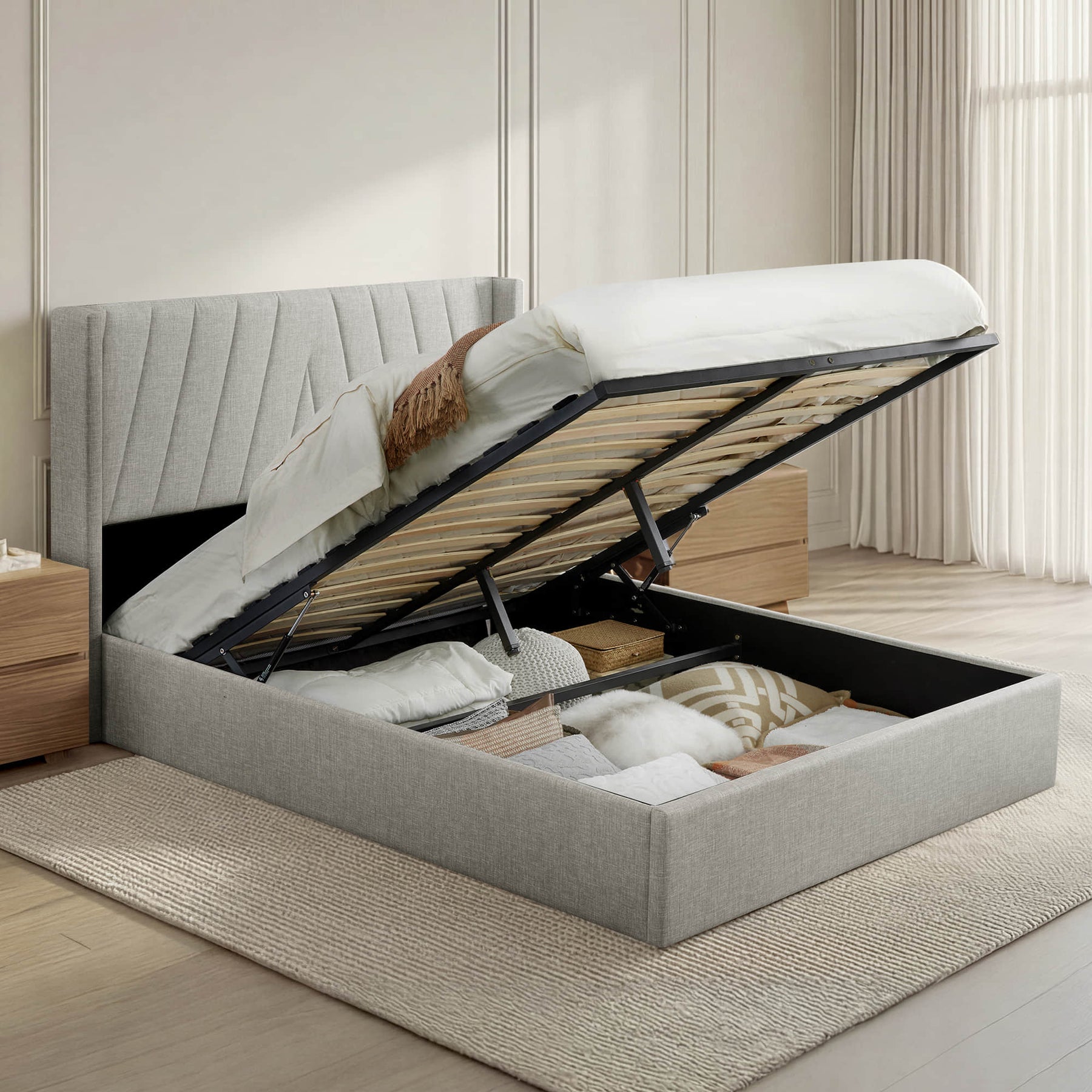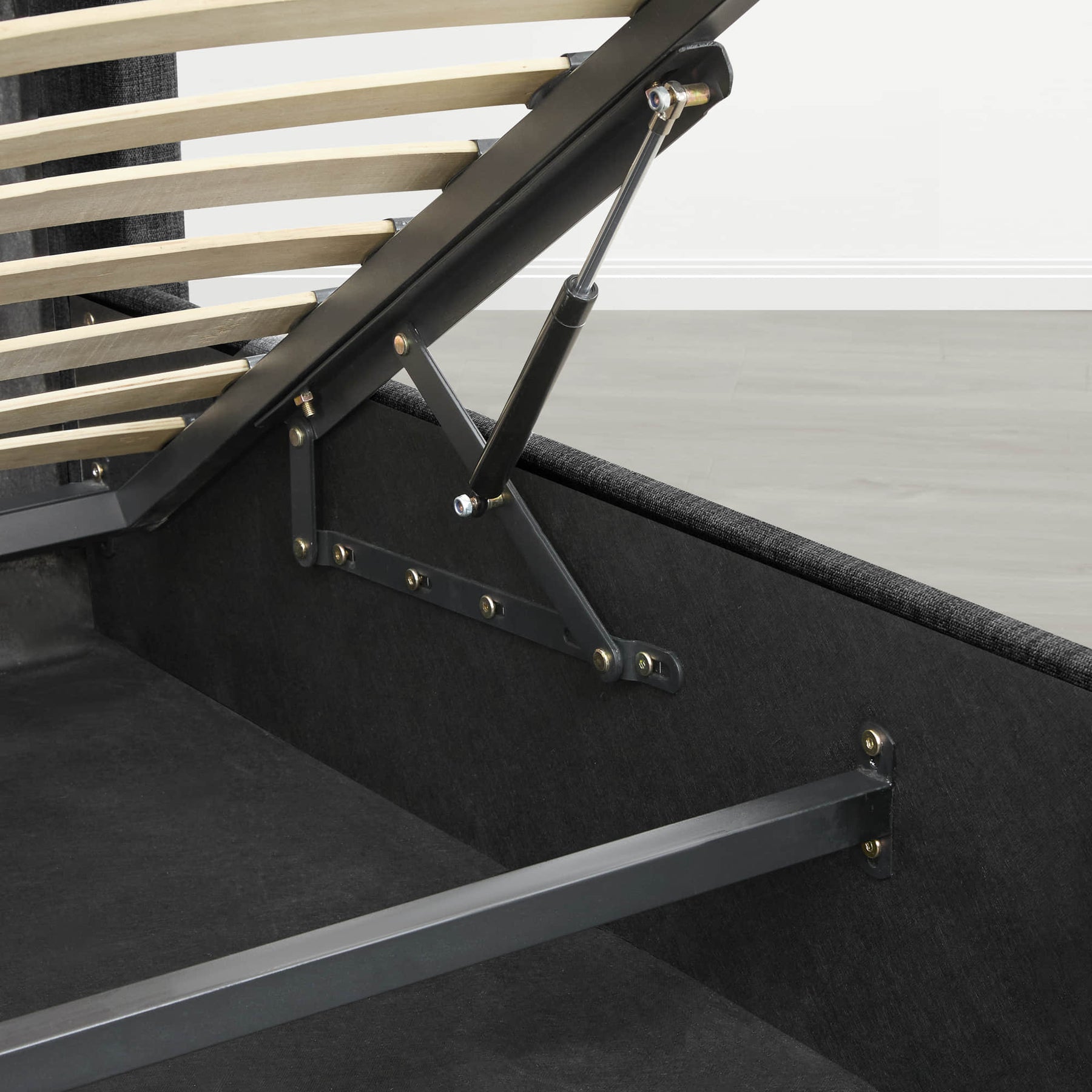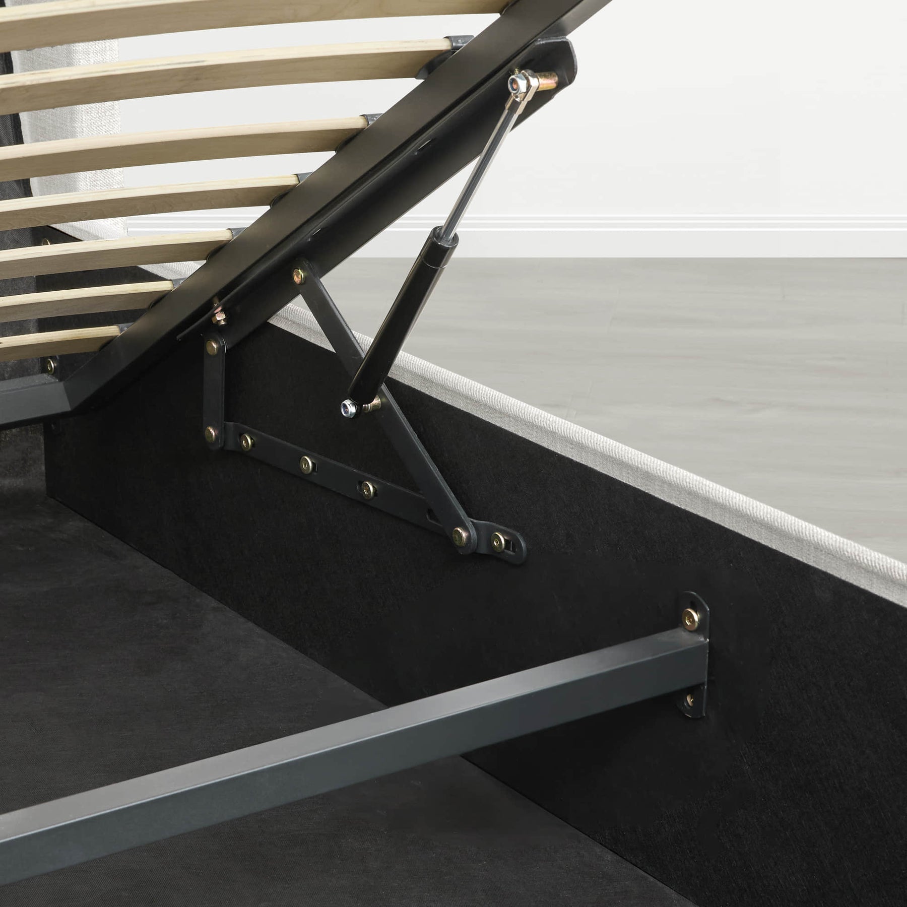 The bed features a hydraulic lift system that allows the mattress platform to be raised smoothly, revealing a concealed storage compartment beneath. The storage area provides approximately 10.6 inches of clearance height and includes a dust-proof mat to help protect stored items. The lifting mechanism is supported by a steel frame with anti-slip components for stability.