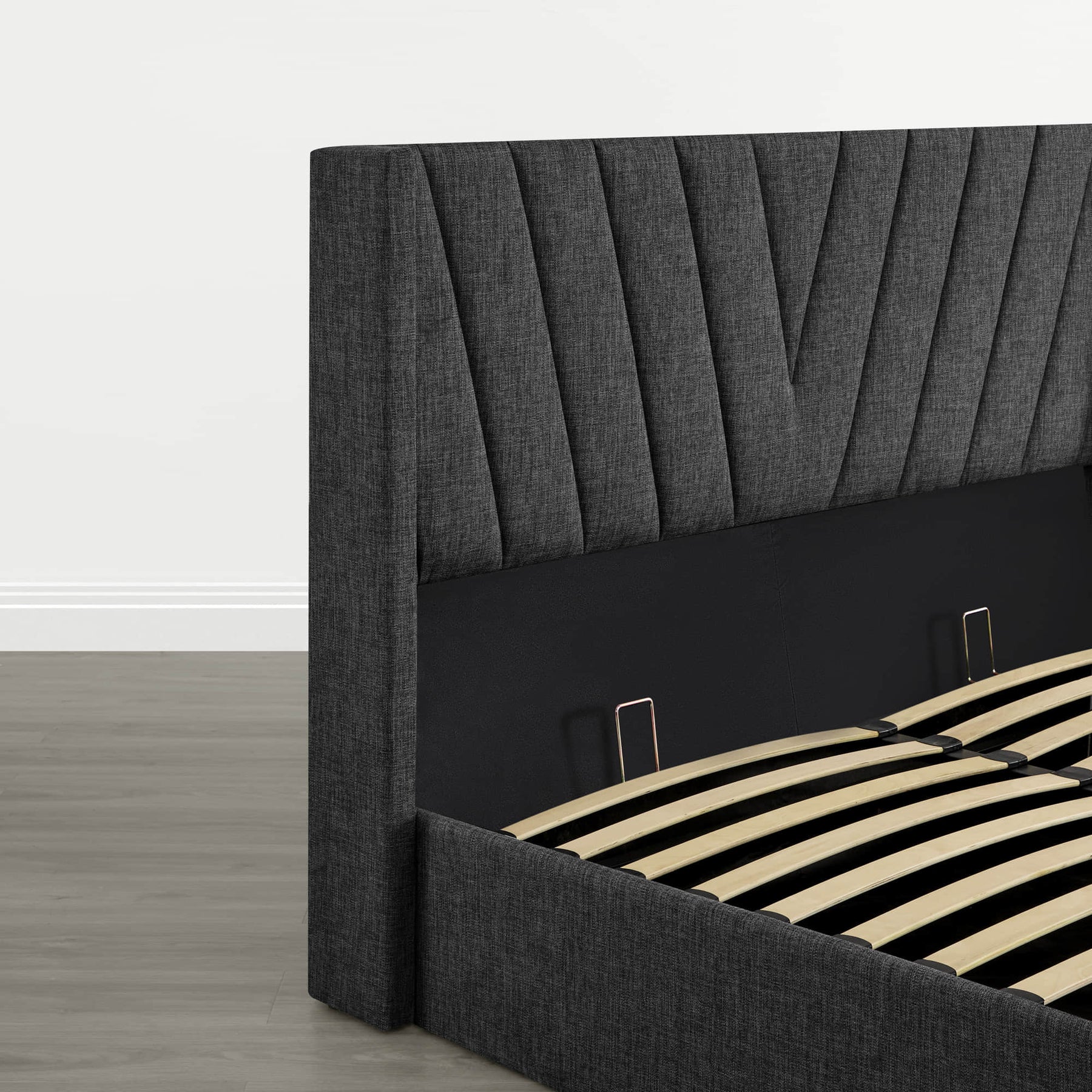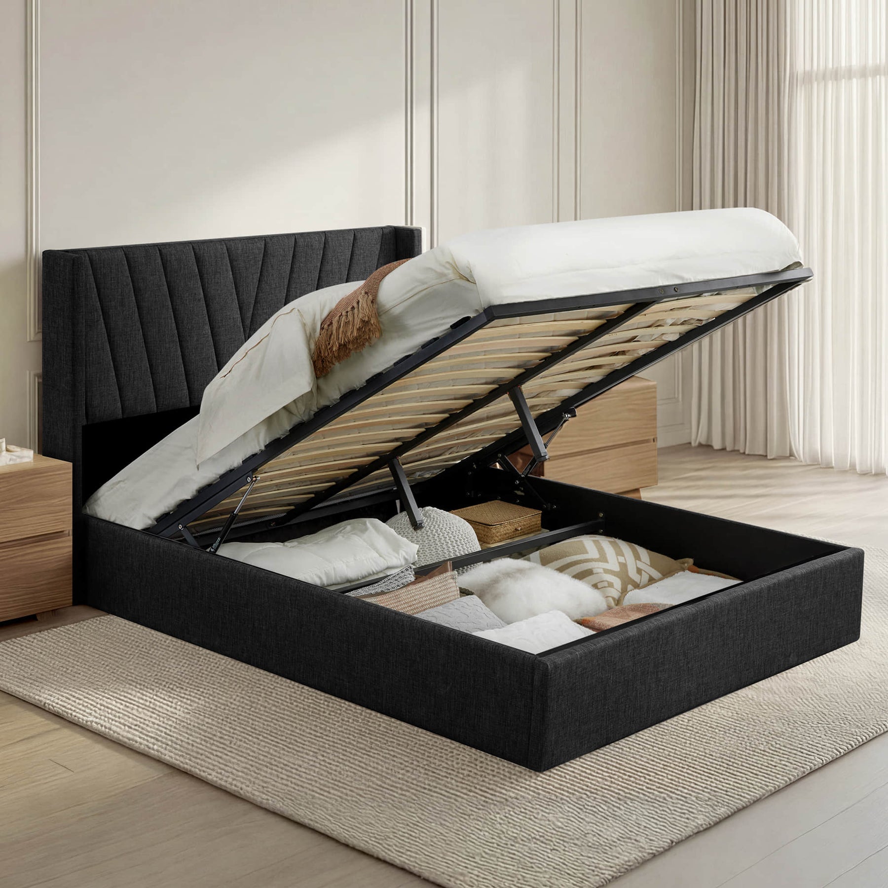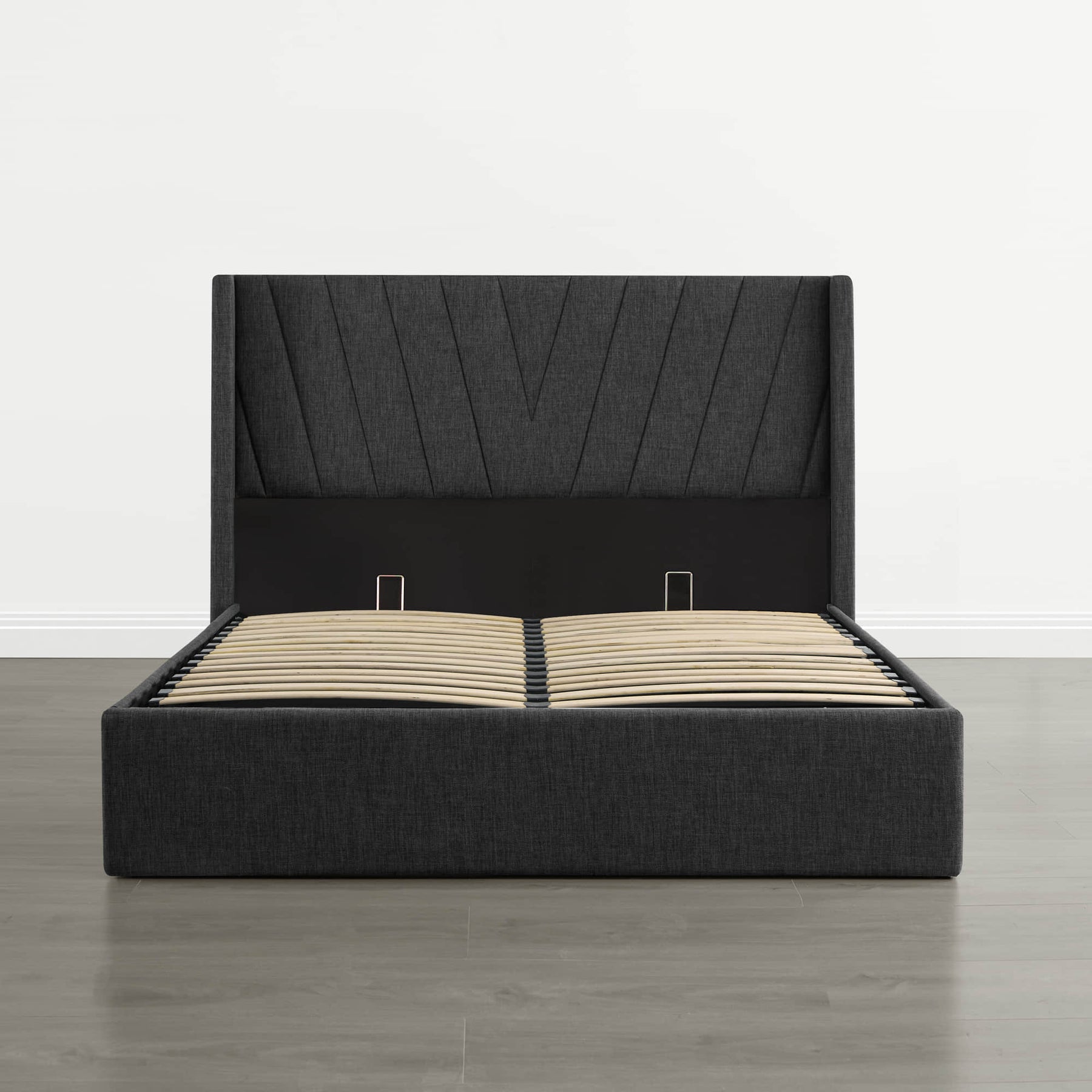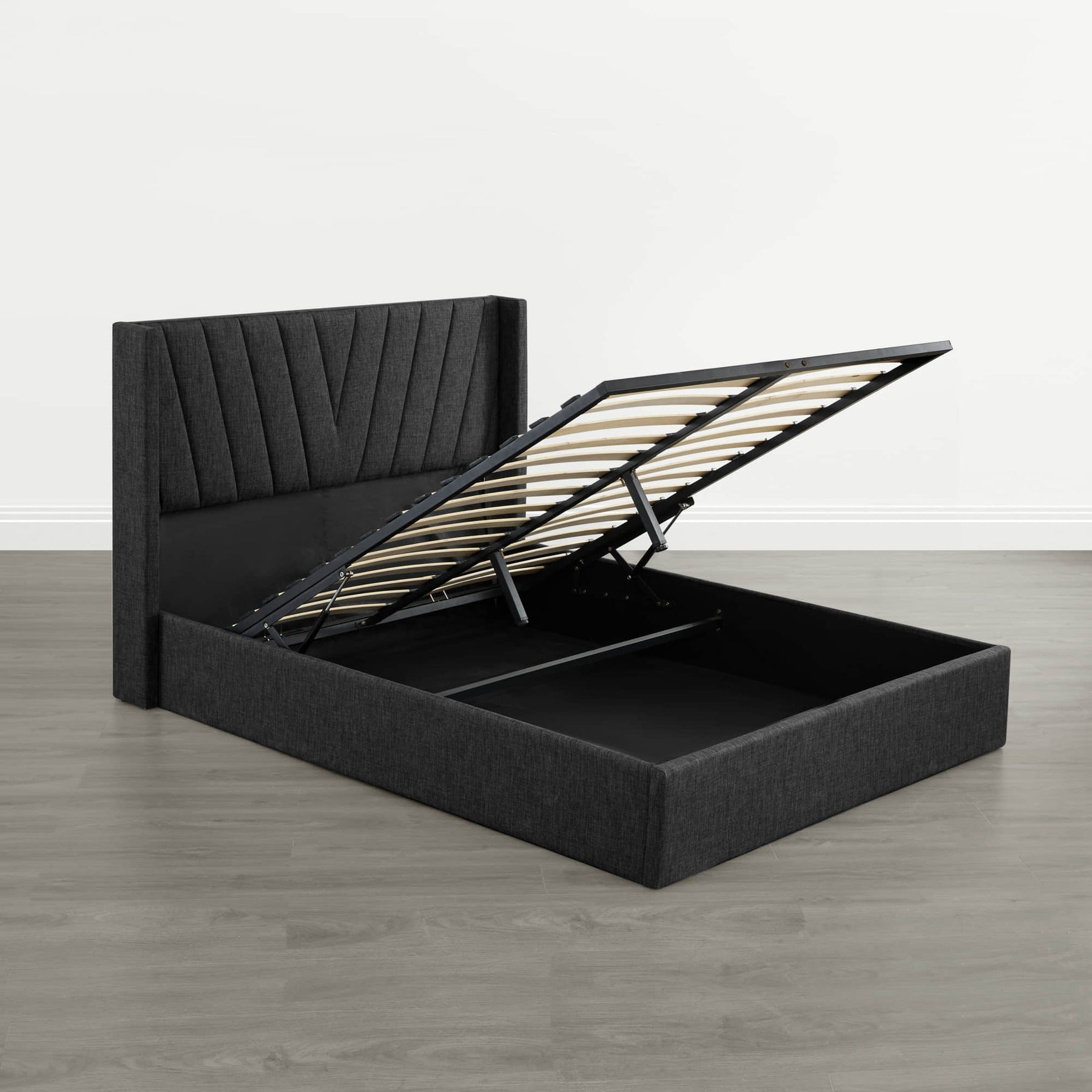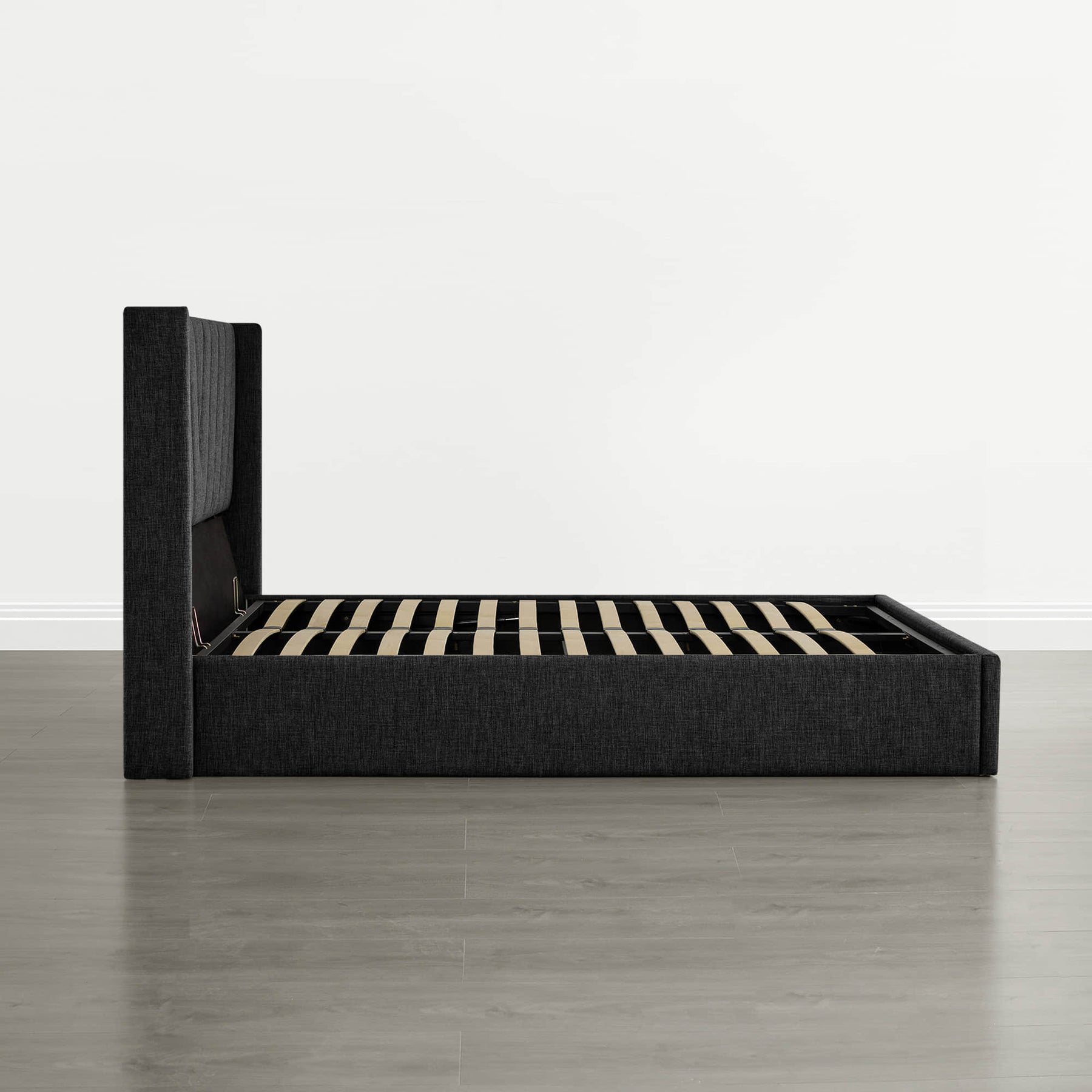 Upholstered wingback platform bed with hydraulic storage